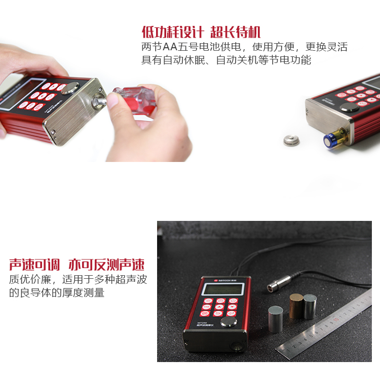 | 美泰系列超聲波測(cè)厚儀,均采用低功耗設(shè)計(jì)理念,超長(zhǎng)待機(jī),MT150/MT160/MT200/MT180/MT192/MT280/MT600/MT660均由兩節(jié)AA五號(hào)電池供電、更換方便。 | |