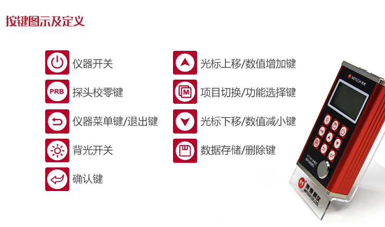 探頭表面為丙烯樹(shù)脂,對(duì)粗糙表面的重劃很敏感,因此在使用中應(yīng)輕按;測(cè)粗糙表面時(shí),盡量減少探頭在工作表面的劃動(dòng)。