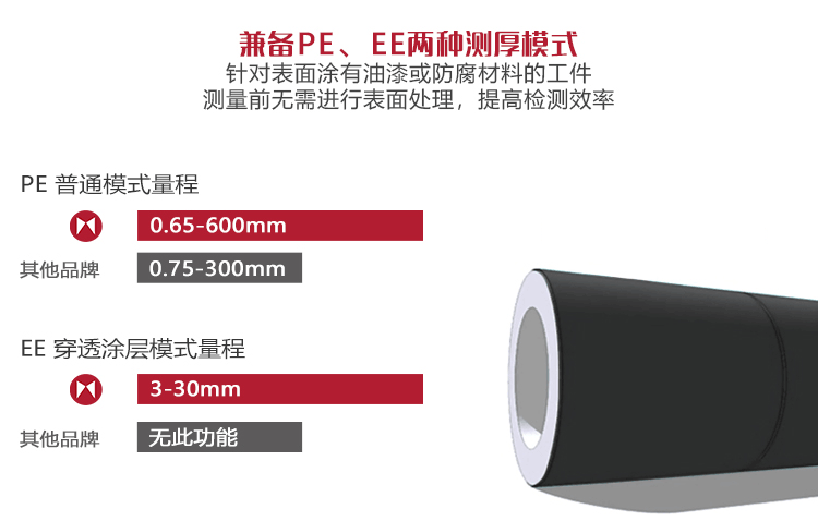 具有兩種測厚模式:發(fā)射-回波模式和回波-回波模式,可以穿透涂層進(jìn)行厚度測量而不計入涂層厚度
