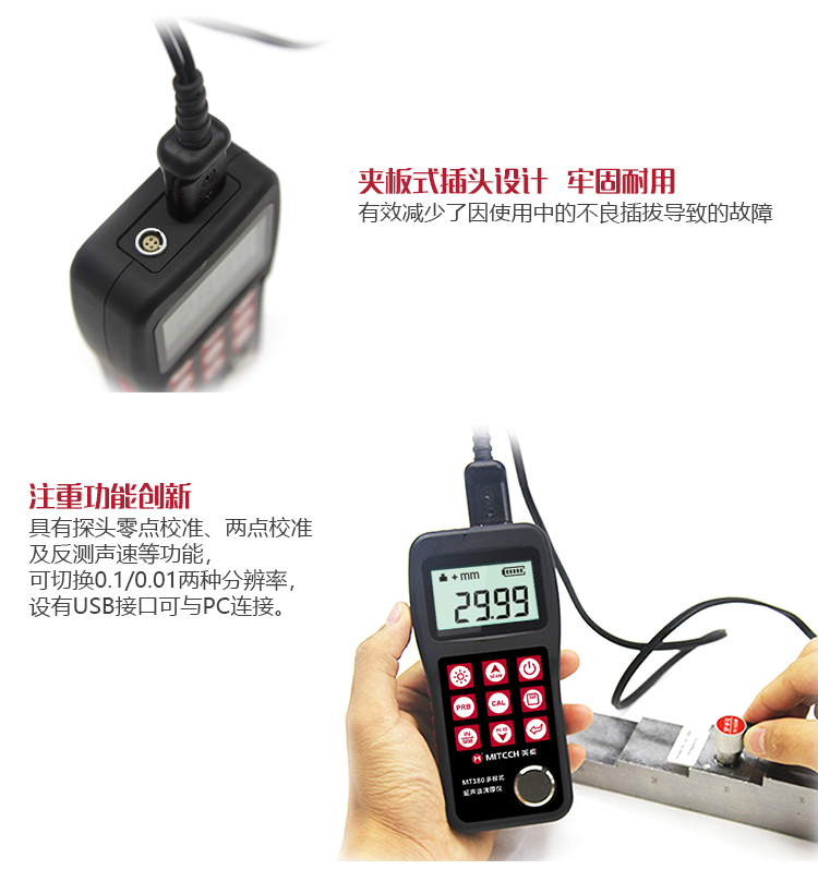 產(chǎn)品概述美泰MT180 超聲波測厚儀,基于超聲波測量原理,可對金屬、塑料、陶瓷、玻璃及其他多種超聲波的良導(dǎo)體材料進(jìn)行厚度測量,也可實現(xiàn)對材料聲速的反測。與傳統(tǒng)的測量方法相比,超聲波測厚儀的優(yōu)勢在于它只要接觸到被測工件的一面即可完成測量,其獨特的可穿透涂層測厚度的性能為表面涂有油漆或防腐材料的工件厚度檢測提供了更加高效的解決方案,測量前無需處理掉表面的涂層,直接亦可測量。被廣泛應(yīng)用于石油、化工、冶金、造船、航空、航天等領(lǐng)域的生產(chǎn)設(shè)備中各種管道及壓力容器腐蝕減薄程度的監(jiān)測,也可用于對各種板材及各種加工零件做精確的測量。是提高生產(chǎn)效率與合格率、節(jié)約成本必備的專業(yè)精密儀器。