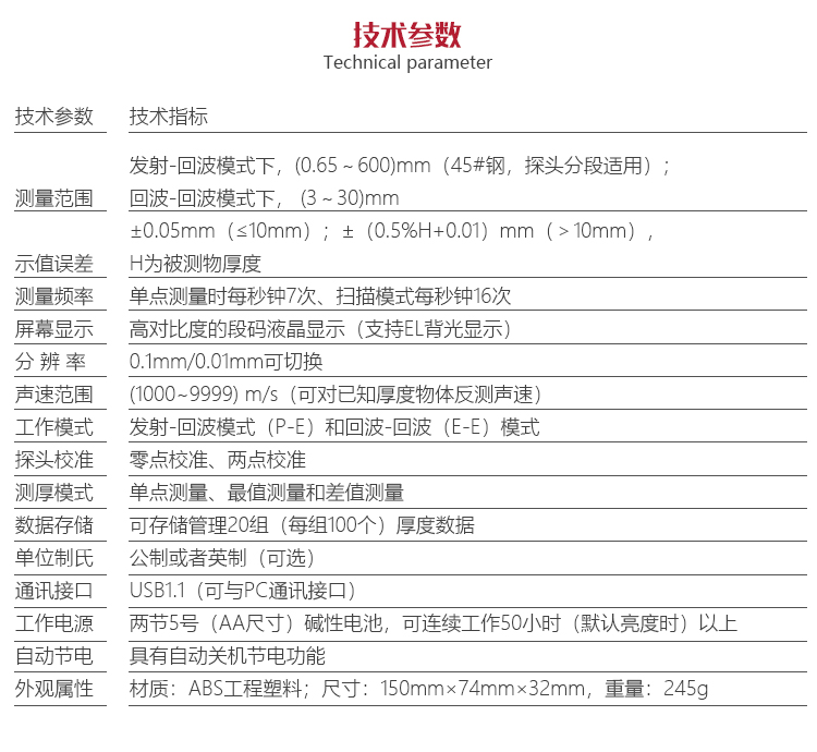 | 測厚模式 | 發(fā)射-回波模式(P-E)和回波-回波(E-E)模式 |