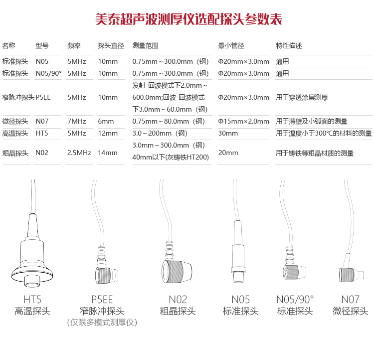 | 探頭直徑 | 測厚探頭NO5直徑10MM、微晶探頭N07直徑6MM、高溫探頭HT5直徑12MM、窄脈沖測厚探頭P5EE直徑10MM、粗晶探頭直徑12MM |