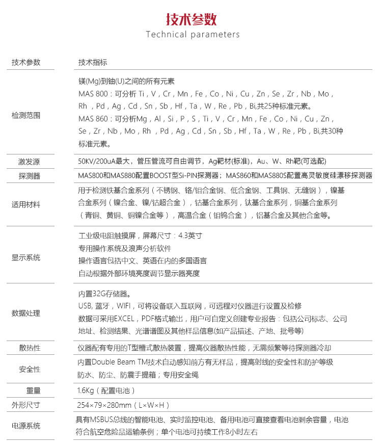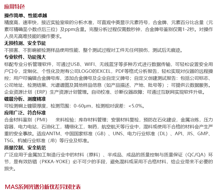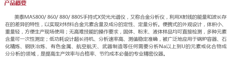 產(chǎn)品概述美泰MAS800 / 860 / 880 /880S手持式X熒光光譜儀,又稱合金分析儀,利用X射線的能量存在差異的特性,以實現(xiàn)對材料合金元素含量及成分的定性、定量分析。便攜式的外觀設(shè)計,體積小、重量輕,方便生產(chǎn)現(xiàn)場使用;無高難技能的操作要求,固體、粉末、液體樣品均可直接檢測,多種元素含量可一次性測定;低功耗設(shè)計超長待機(jī)、分析速率高、測值穩(wěn)定準(zhǔn)確,被廣泛地應(yīng)用于鍋爐容器、石化精煉、鋼鐵冶煉、有色金屬、航空航天、武器制造等任何需要分析Na以上到U的元素或化合物成分分析的領(lǐng)域,是提高生產(chǎn)效率與合格率、節(jié)約成本必備的專業(yè)精密儀器。