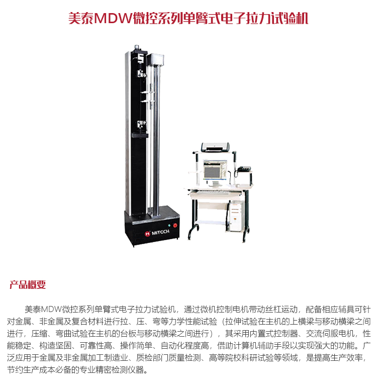 產(chǎn)品概述美泰MDW微控系列單臂式電子拉力試驗(yàn)機(jī),通過(guò)微機(jī)控制電機(jī)帶動(dòng)絲杠運(yùn)動(dòng),配備相應(yīng)輔具可針對(duì)金屬、非金屬及復(fù)合材料進(jìn)行拉、壓、彎等力學(xué)性能試驗(yàn)(拉伸試驗(yàn)在主機(jī)的上橫梁與移動(dòng)橫梁之間進(jìn)行,壓縮、彎曲試驗(yàn)在主機(jī)的臺(tái)板與移動(dòng)橫梁之間進(jìn)行),其采用內(nèi)置式控制器、交流伺服電機(jī),性能穩(wěn)定、構(gòu)造堅(jiān)固、可靠性高、操作簡(jiǎn)單、自動(dòng)化程度高,借助計(jì)算機(jī)輔助手段以實(shí)現(xiàn)強(qiáng)大的功能。廣泛應(yīng)用于金屬及非金屬加工制造業(yè)、質(zhì)檢部門質(zhì)量檢測(cè)、高等院??蒲性囼?yàn)等領(lǐng)域,是提高生產(chǎn)效率,節(jié)約生產(chǎn)成本必備的專業(yè)精密檢測(cè)儀器。