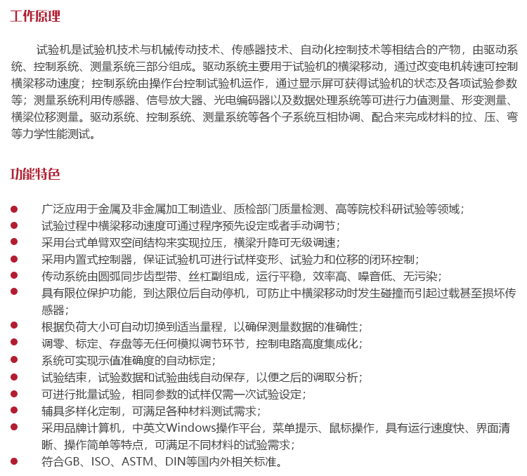 采用臺(tái)式單臂雙空間結(jié)構(gòu)來(lái)實(shí)現(xiàn)拉壓,橫梁升降可無(wú)級(jí)調(diào)速;