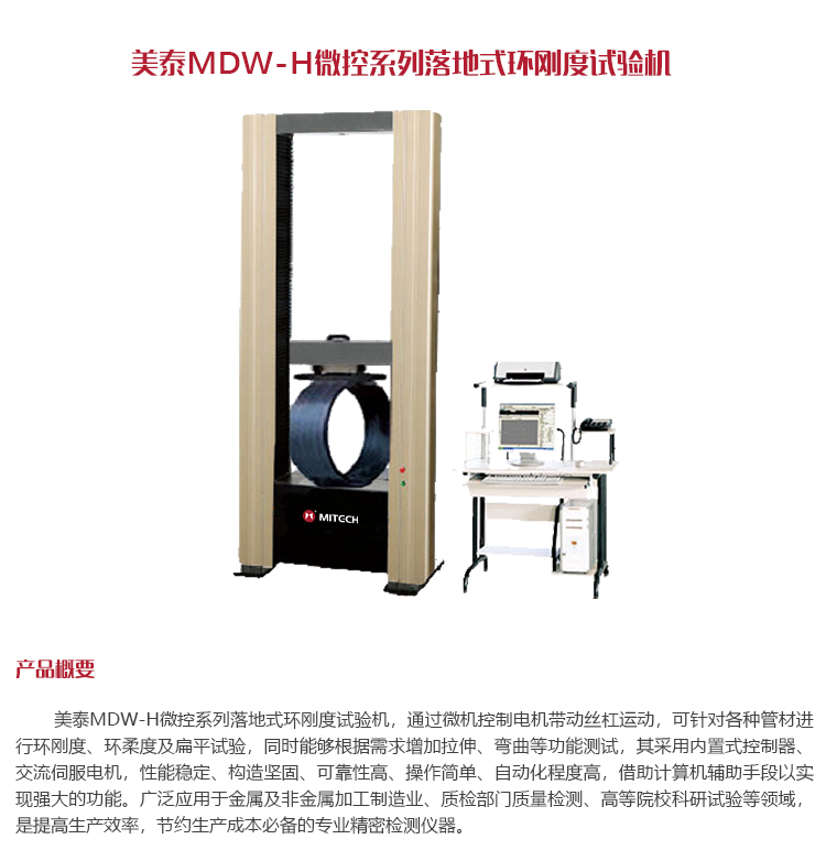 產(chǎn)品概述美泰MDW-H微控系列落地式環(huán)剛度試驗機,通過微機控制電機帶動絲杠運動,可針對各種管材進行環(huán)剛度、環(huán)柔度及扁平試驗,同時能夠根據(jù)需求增加拉伸、彎曲等功能測試,其采用內(nèi)置式控制器、交流伺服電機,性能穩(wěn)定、構(gòu)造堅固、可靠性高、操作簡單、自動化程度高,借助計算機輔助手段以實現(xiàn)強大的功能。廣泛應(yīng)用于金屬及非金屬加工制造業(yè)、質(zhì)檢部門質(zhì)量檢測、高等院??蒲性囼灥阮I(lǐng)域,是提高生產(chǎn)效率,節(jié)約生產(chǎn)成本必備的專業(yè)精密檢測儀器。