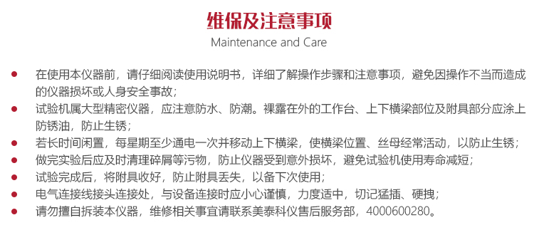試驗機屬大型精密儀器,應(yīng)注意防水、防潮。裸露在外的工作臺、上下橫梁部位及附具部分應(yīng)涂上防銹油,防止生銹;