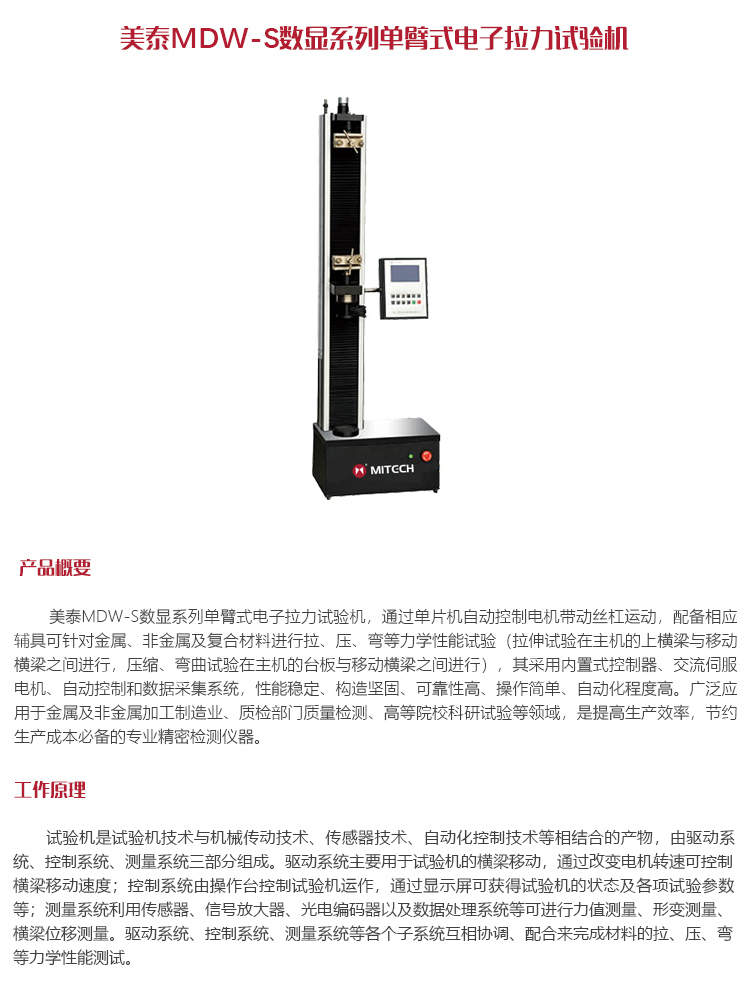 產(chǎn)品概述美泰MDW-S數(shù)顯系列單臂式電子拉力試驗(yàn)機(jī),通過(guò)單片機(jī)自動(dòng)控制電機(jī)帶動(dòng)絲杠運(yùn)動(dòng),配備相應(yīng)輔具可針對(duì)金屬、非金屬及復(fù)合材料進(jìn)行拉、壓、彎等力學(xué)性能試驗(yàn)(拉伸試驗(yàn)在主機(jī)的上橫梁與移動(dòng)橫梁之間進(jìn)行,壓縮、彎曲試驗(yàn)在主機(jī)的臺(tái)板與移動(dòng)橫梁之間進(jìn)行),其采用內(nèi)置式控制器、交流伺服電機(jī)、自動(dòng)控制和數(shù)據(jù)采集系統(tǒng),性能穩(wěn)定、構(gòu)造堅(jiān)固、可靠性高、操作簡(jiǎn)單、自動(dòng)化程度高。廣泛應(yīng)用于金屬及非金屬加工制造業(yè)、質(zhì)檢部門質(zhì)量檢測(cè)、高等院校科研試驗(yàn)等領(lǐng)域,是提高生產(chǎn)效率,節(jié)約生產(chǎn)成本必備的專業(yè)精密檢測(cè)儀器。