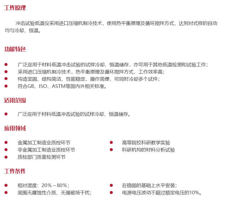 儀器特點(diǎn)廣泛應(yīng)用于材料低溫沖擊試驗(yàn)的試樣冷卻、恒溫儲(chǔ)存,亦可用于其他低溫檢測(cè)和試驗(yàn)工作;