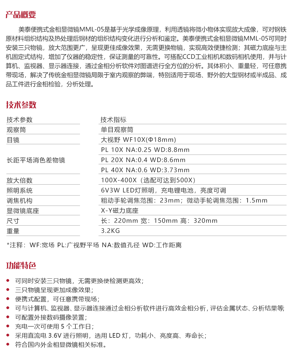 產(chǎn)品概述美泰便攜式金相顯微鏡MML-05是基于光學成像原理,利用透鏡將微小物體實現(xiàn)放大成像,可對鋼鐵原材料組織結構及熱處理后鋼材的組織結構變化進行分析和鑒定。美泰便攜式金相顯微鏡MML-05可同時安裝三只物鏡,放大范圍更廣,呈現(xiàn)更佳成像效果,無需更換物鏡,實現(xiàn)高效便捷檢測;其磁力底座與主機固定式結構,增加了儀器的穩(wěn)定性,保證測量的可靠性。可配置CCD工業(yè)相機和數(shù)碼相機使用,可與計算機、監(jiān)視器、顯示器連接,通過金相分析軟件對圖譜進行全方位的分析。其體積小、重量輕,可任意攜帶現(xiàn)場,解決了傳統(tǒng)金相顯微鏡局限于室內觀察的弊端,特別適用于現(xiàn)場、野外的大型鋼材或半成品、成品工件進行金相檢驗,分析處理。