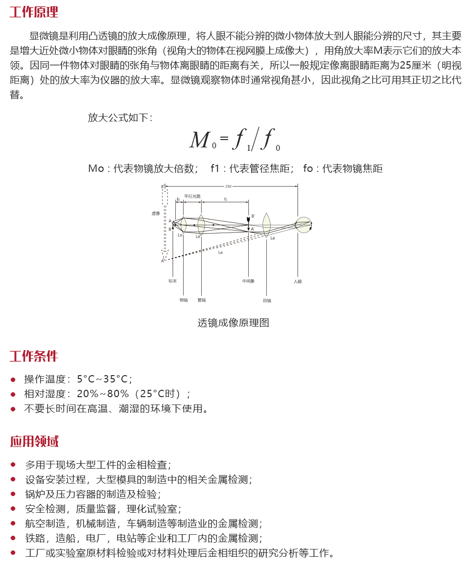 工作原理顯微鏡是利用凸透鏡的放大成像原理,將人眼不能分辨的微小物體放大到人眼能分辨的尺寸,其主要是增大近處微小物體對眼睛的張角(視角大的物體在視網(wǎng)膜上成像大),用角放大率M表示它們的放大本領。因同一件物體對眼睛的張角與物體離眼睛的距離有關,所以一般規(guī)定像離眼睛距離為25厘米(明視距離)處的放大率為儀器的放大率。顯微鏡觀察物體時通常視角甚小,因此視角之比可用其正切之比代替。