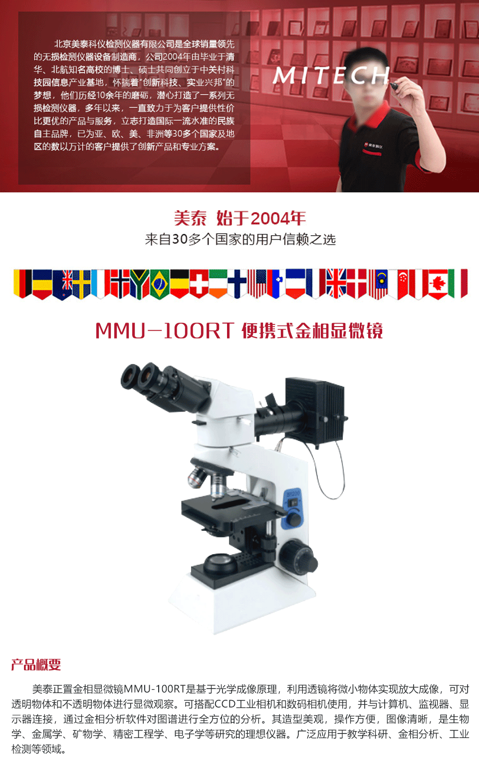 產(chǎn)品概述美泰正置金相顯微鏡MMU-100RT是基于光學(xué)成像原理,利用透鏡將微小物體實現(xiàn)放大成像,可對透明物體和不透明物體進行顯微觀察。可搭配CCD工業(yè)相機和數(shù)碼相機使用,并與計算機、監(jiān)視器、顯示器連接,通過金相分析軟件對圖譜進行全方位的分析。其造型美觀,操作方便,圖像清晰,是生物學(xué)、金屬學(xué)、礦物學(xué)、精密工程學(xué)、電子學(xué)等研究的理想儀器。廣泛應(yīng)用于教學(xué)科研、金相分析、工業(yè)檢測等領(lǐng)域。