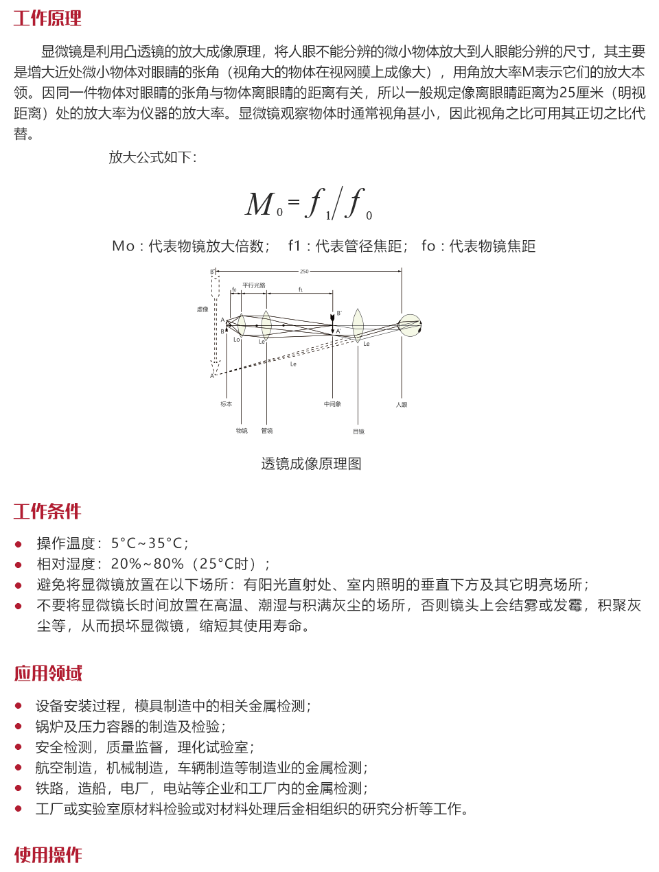 工作原理顯微鏡是利用凸透鏡的放大成像原理,將人眼不能分辨的微小物體放大到人眼能分辨的尺寸,其主要是增大近處微小物體對眼睛的張角(視角大的物體在視網(wǎng)膜上成像大),用角放大率M表示它們的放大本領(lǐng)。因同一件物體對眼睛的張角與物體離眼睛的距離有關(guān),所以一般規(guī)定像離眼睛距離為25厘米(明視距離)處的放大率為儀器的放大率。顯微鏡觀察物體時通常視角甚小,因此視角之比可用其正切之比代替。