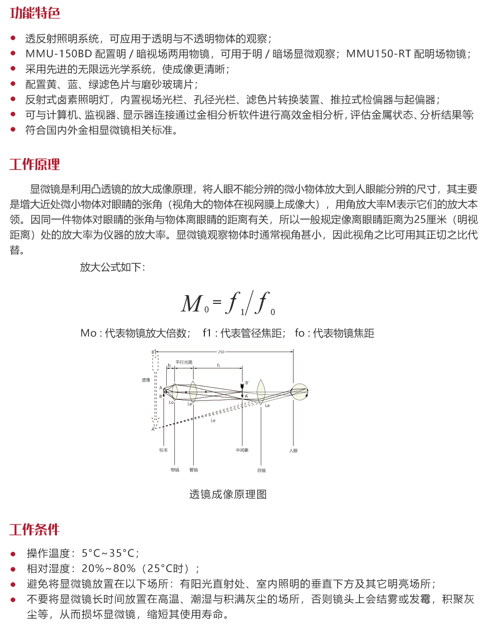 產(chǎn)品概述美泰正置金相顯微鏡MMU-150RT/150BD是基于光學(xué)成像原理,利用透鏡將微小物體實(shí)現(xiàn)放大成像,可對(duì)透明物體和不透明物體進(jìn)行顯微觀察。采用優(yōu)良的無限遠(yuǎn)光學(xué)系統(tǒng)與模塊化功能設(shè)計(jì)理念,可提供卓越的光學(xué)性能與產(chǎn)品系統(tǒng)升級(jí),實(shí)現(xiàn)透反射同步或獨(dú)立照明、偏振光觀察、暗場觀察等功能。其造型美觀,操作方便,圖像清晰,是生物學(xué)、金屬學(xué)、礦物學(xué)、精密工程學(xué)、電子學(xué)等研究的理想儀器。被廣泛應(yīng)用于教學(xué)科研、金相分析、工業(yè)檢測等領(lǐng)域。