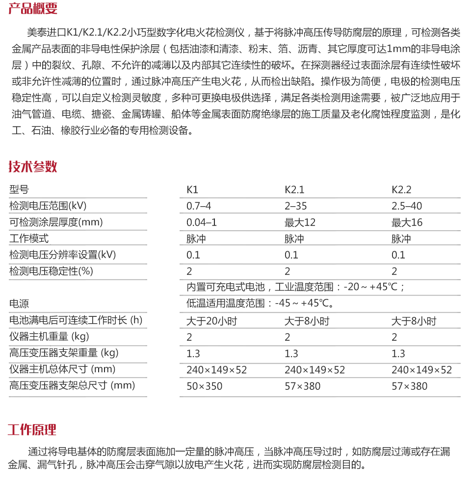 產(chǎn)品概述美泰進口K1/K2.1/K2.2小巧型數(shù)字化電火花檢測儀,基于將脈沖高壓傳導(dǎo)防腐層的原理,可檢測各類金屬產(chǎn)品表面的非導(dǎo)電性保護涂層(包括油漆和清漆、粉末、箔、瀝青、其它厚度可達1mm的非導(dǎo)電涂層)中的裂紋、孔隙、不允許的減薄以及內(nèi)部其它連續(xù)性的破壞。在探測器經(jīng)過表面涂層有連續(xù)性破壞或非允許性減薄的位置時,通過脈沖高壓產(chǎn)生電火花,從而檢出缺陷。操作極為簡便,電極的檢測電壓穩(wěn)定性高,可以自定義檢測靈敏度,多種可更換電極供選擇,滿足各類檢測用途需要,被廣泛地應(yīng)用于油氣管道、電纜、搪瓷、金屬鑄罐、船體等金屬表面防腐絕緣層的施工質(zhì)量及老化腐蝕程度監(jiān)測,是化工、石油、橡膠行業(yè)必備的專用檢測設(shè)備。