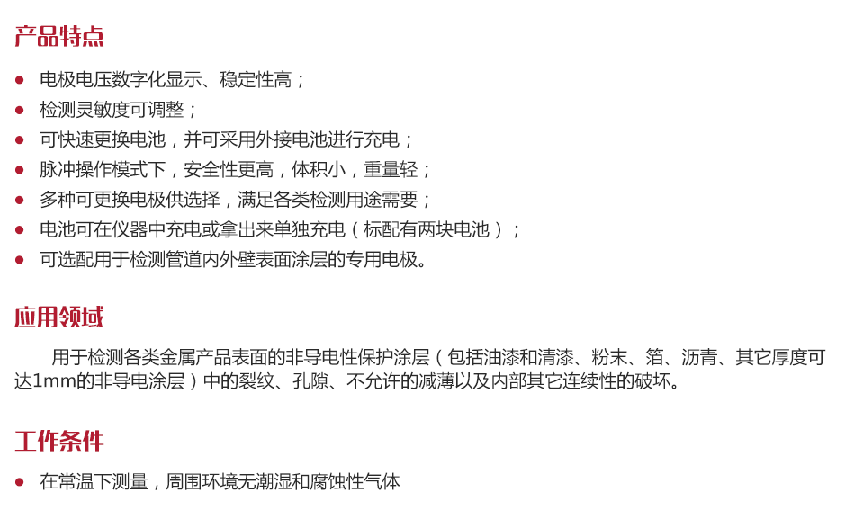 功能用途用于檢測各類金屬產(chǎn)品表面的非導(dǎo)電性保護涂層(包括油漆和清漆、粉末、箔、瀝青、其它厚度可達1mm的非導(dǎo)電涂層)中的裂紋、孔隙、不允許的減薄以及內(nèi)部其它連續(xù)性的破壞。