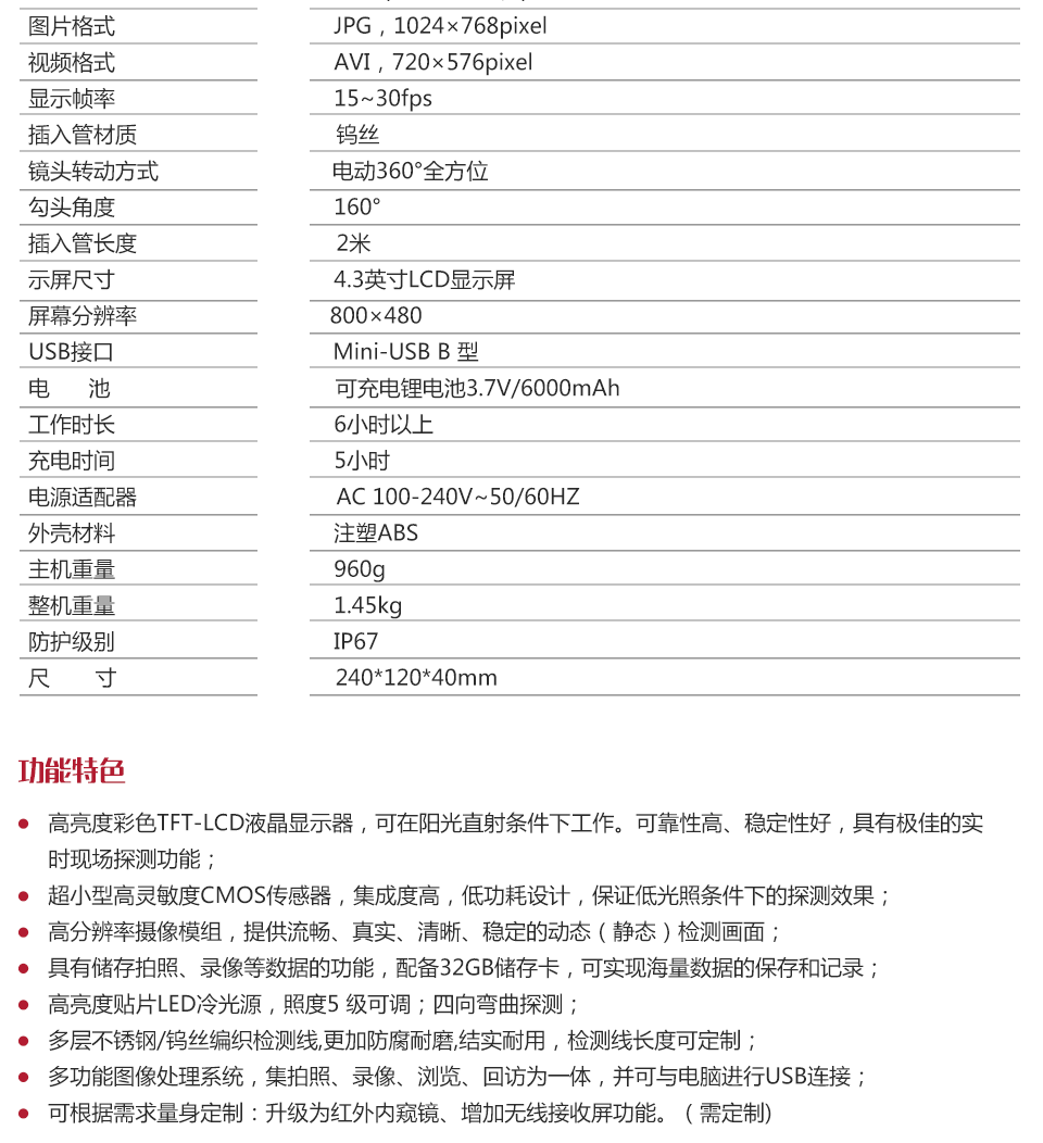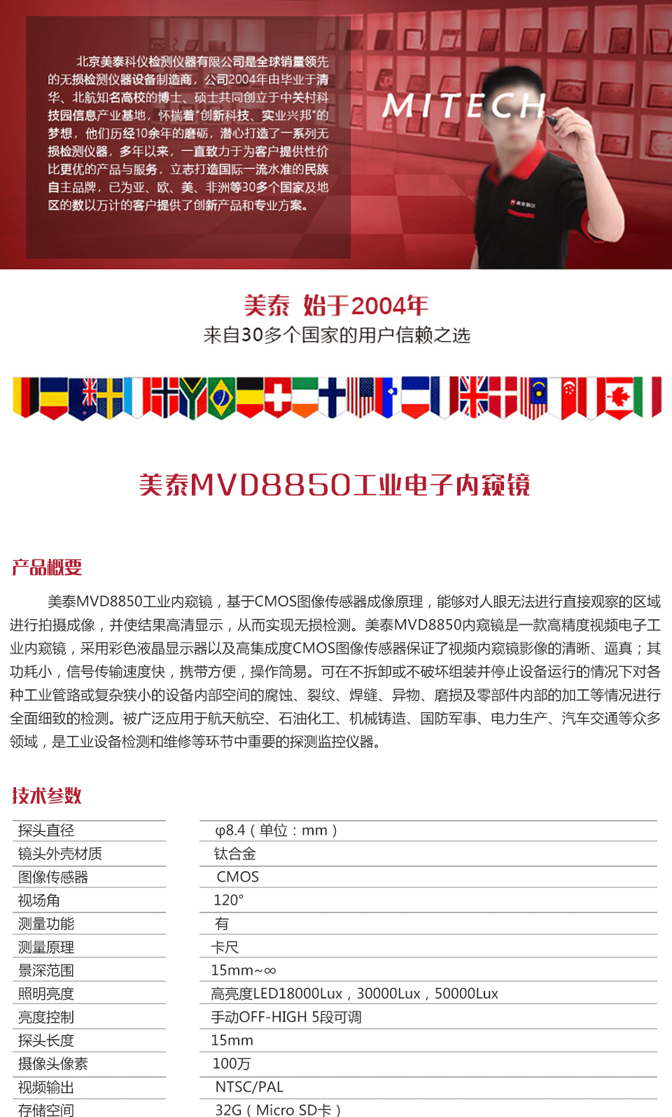 產(chǎn)品概述美泰MVD8850工業(yè)內(nèi)窺鏡,基于CMOS圖像傳感器成像原理,能夠對人眼無法進行直接觀察的區(qū)域進行拍攝成像,并使結(jié)果高清顯示,從而實現(xiàn)無損檢測。美泰MVD8850內(nèi)窺鏡是一款高精度視頻電子工業(yè)內(nèi)窺鏡,采用彩色液晶顯示器以及高集成度CMOS圖像傳感器保證了視頻內(nèi)窺鏡影像的清晰、逼真;其功耗小,信號傳輸速度快,攜帶方便,操作簡易??稍?/span>不拆卸或不破壞組裝并停止設(shè)備運行的情況下對各種工業(yè)管路或復(fù)雜狹小的設(shè)備內(nèi)部空間的腐蝕、裂紋、焊縫、異物、磨損及零部件內(nèi)部的加工等情況進行全面細致的檢測。被廣泛應(yīng)用于航天航空、石油化工、機械鑄造、國防軍事、電力生產(chǎn)、汽車交通等眾多領(lǐng)域,是工業(yè)設(shè)備檢測和維修等環(huán)節(jié)中重要的探測監(jiān)控儀器。