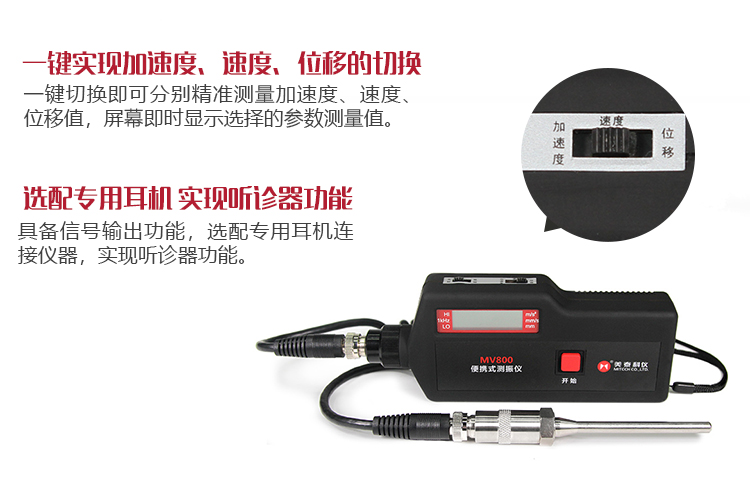 產(chǎn)品概述美泰便攜式測振儀MV800系列是由壓電式傳感器和數(shù)字顯示電路組成的手持式測振儀表,主要用于測量各種旋轉(zhuǎn)機(jī)械的振動加速度、速度和位移。MV800系列分兩種型號MV800-5(頻響范圍:5Hz~10KHz)和MV800-10(頻響范圍:10Hz~10KH),可滿足常規(guī)測振使用需求以及低頻振動測量需求。該產(chǎn)品測量范圍廣,顯示直觀、一體化的設(shè)計(jì)體積小、重量輕,測量攜帶方便,特別適用于野外無電源的現(xiàn)場作業(yè)及高空作業(yè),大大減少工作人員的工作強(qiáng)度,提高工作效率。