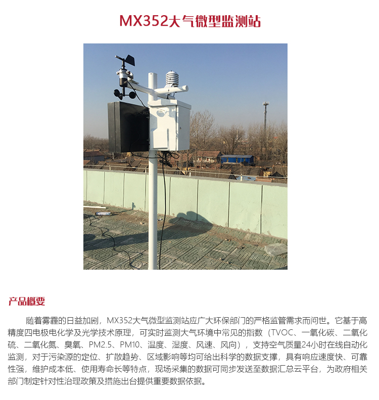 產(chǎn)品概述隨著霧霾的日益加劇,MX352大氣微型監(jiān)測站應(yīng)廣大環(huán)保部門的嚴(yán)格監(jiān)管需求而問世。它基于高精度四電極電化學(xué)及光學(xué)技術(shù)原理,可實(shí)時監(jiān)測大氣環(huán)境中常見的指數(shù)(TVOC、一氧化碳、二氧化硫、二氧化氮、臭氧、PM2.5、PM10、溫度、濕度、風(fēng)速、風(fēng)向),支持空氣質(zhì)量24小時在線自動化監(jiān)測,對于污染源的定位、擴(kuò)散趨勢、區(qū)域影響等均可給出科學(xué)的數(shù)據(jù)支撐,具有響應(yīng)速度快、可靠性強(qiáng),維護(hù)成本低、使用壽命長等特點(diǎn),現(xiàn)場采集的數(shù)據(jù)可同步發(fā)送至數(shù)據(jù)匯總云平臺,為政府相關(guān)部門制定針對性治理政策及措施出臺提供重要數(shù)據(jù)依據(jù)。