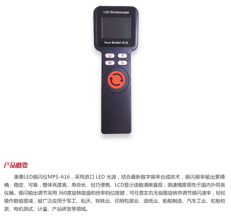 美泰LED頻閃儀MPS-A16,采用進(jìn)口 LED 光源,結(jié)合最新數(shù)字頻率合成技術(shù),頻閃頻率輸出更精確、穩(wěn)定、可靠,整體亮度高、壽命長(zhǎng)、輕巧便攜、LCD顯示讀數(shù)清晰直觀;測(cè)速精度領(lǐng)先于國(guó)內(nèi)外同類(lèi)儀器。頻閃輸出調(diào)節(jié)采用 360 度旋轉(zhuǎn)撥盤(pán)和倍率檔位按鍵,可任意左右無(wú)極限旋轉(zhuǎn)并調(diào)節(jié)頻閃速率,輕松操作數(shù)值增減,被廣泛應(yīng)用于軍工、航天、鋼鐵業(yè)、印刷包裝業(yè)、造紙業(yè)、船舶制造、汽車(chē)工業(yè)、輪胎檢測(cè)、電機(jī)測(cè)試、計(jì)量、產(chǎn)品研發(fā)等領(lǐng)域。
