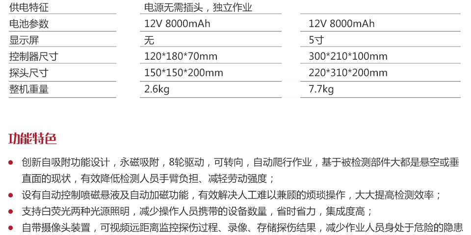 儀器特點(diǎn)? 創(chuàng)新自吸附功能設(shè)計(jì),永磁吸附,8輪驅(qū)動(dòng),可轉(zhuǎn)向,自動(dòng)爬行作業(yè),基于被檢測部件大都是懸空或垂直面的現(xiàn)狀,有效降低檢測人員手臂負(fù)擔(dān)、減輕勞動(dòng)強(qiáng)度;