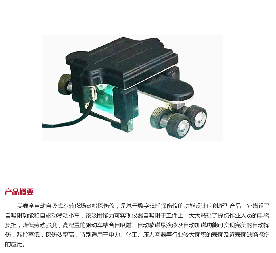 產(chǎn)品概述美泰全自動(dòng)自吸式旋轉(zhuǎn)磁場磁粉探傷儀,是基于數(shù)字磁粉探傷儀的功能設(shè)計(jì)的創(chuàng)新型產(chǎn)品,它增設(shè)了自吸附功能和自驅(qū)動(dòng)移動(dòng)小車,該吸附能力可實(shí)現(xiàn)儀器自吸附于工件上,大大減輕了探傷作業(yè)人員的手臂負(fù)擔(dān),降低勞動(dòng)強(qiáng)度,高配置的驅(qū)動(dòng)車結(jié)合自吸附、自動(dòng)噴磁懸液液及自動(dòng)加磁功能可實(shí)現(xiàn)完美的自動(dòng)探傷,漏檢率低,探傷效率高,特別適用于電力、化工、壓力容器等行業(yè)較大面積的表面及近表面缺陷探傷的應(yīng)用。