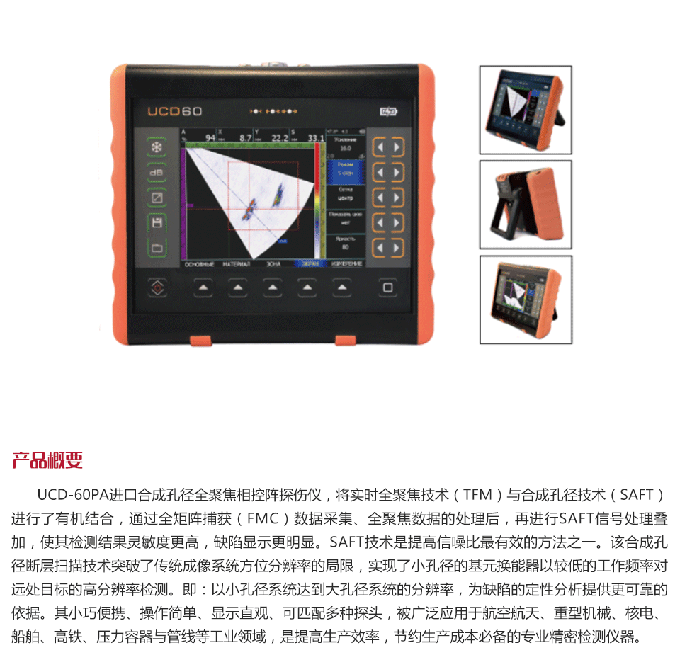 產(chǎn)品概述進(jìn)口UCD-60合成孔徑全聚焦相控陣檢測儀,實(shí)現(xiàn)全聚焦技術(shù)(TFM)與合成孔徑技術(shù)(SAFT)有機(jī)結(jié)合,合成孔徑斷層掃描技術(shù)方法突破了傳統(tǒng)成像系統(tǒng)方位分辨率的概念,實(shí)現(xiàn)了以小孔徑系統(tǒng)達(dá)到大孔徑系統(tǒng)的分辨率,檢測結(jié)果靈敏度更高,缺陷顯示更加明顯,為缺陷的定性分析提供更可靠的依據(jù)。其小巧便攜、操作簡單、顯示直觀、可匹配多種傳感器,廣泛應(yīng)用于航空航天、重型機(jī)械、核電、船舶、高鐵、壓力容器與管線等工業(yè)領(lǐng)域,是提高生產(chǎn)效率,節(jié)約生產(chǎn)成本必備的專業(yè)精密檢測儀器。