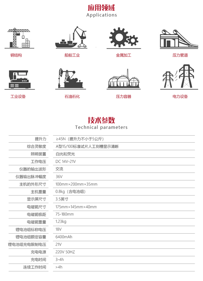 功能用途飛機(jī)制造、鍋爐壓力容器、電力、油田、造船、汽輪機(jī)和內(nèi)燃機(jī)配件、煤礦、機(jī)械、標(biāo)準(zhǔn)件、油泵油嘴、汽車(chē)零件、造橋、化工、鐵路、大型機(jī)械零部件、鋼結(jié)構(gòu)設(shè)備等行業(yè)產(chǎn)品;因鍛壓、淬火、焊接、疲勞等引起的表面及近表面缺陷,如鏈桿、曲軸、軸承、高強(qiáng)度螺栓、彈簧、鍛件、石化管件、閥門(mén)、葉片、齒輪、錨鏈以及焊縫等幾何形狀復(fù)雜的工件等。