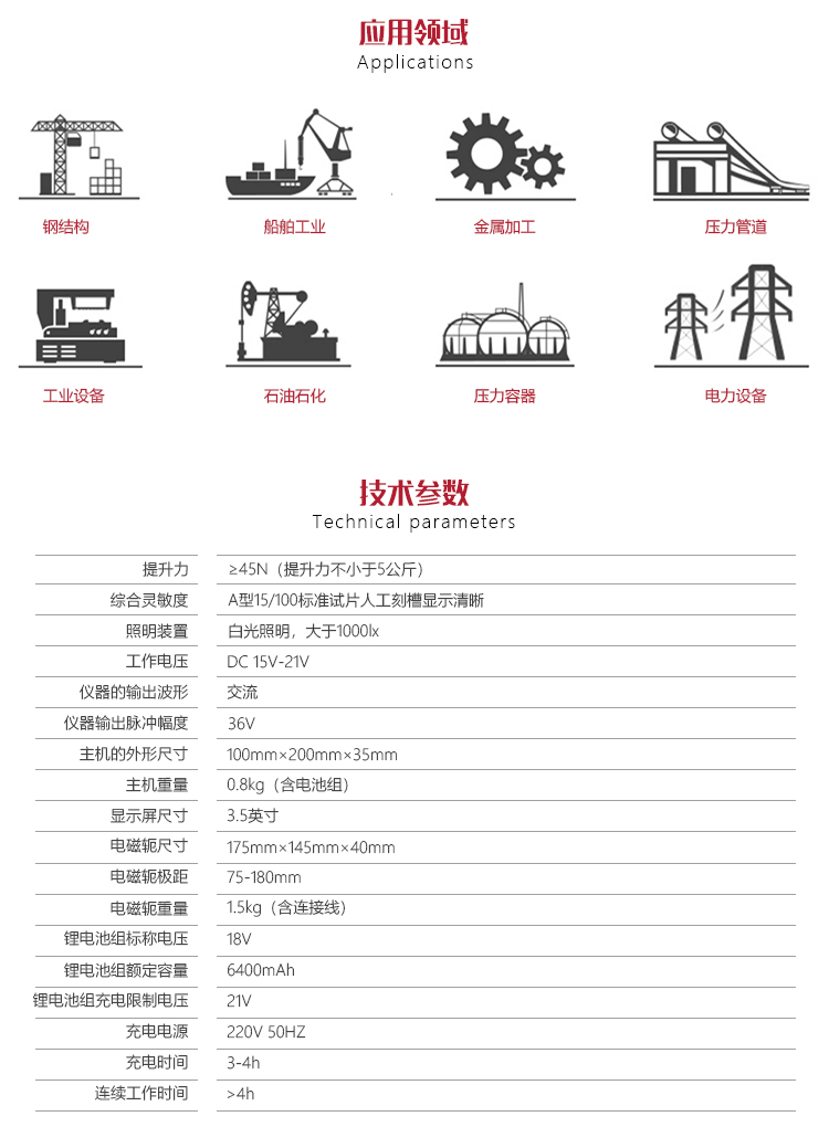 功能用途飛機(jī)制造、鍋爐壓力容器、電力、油田、造船、汽輪機(jī)和內(nèi)燃機(jī)配件、煤礦、機(jī)械、標(biāo)準(zhǔn)件、油泵油嘴、汽車零件、造橋、化工、鐵路、大型機(jī)械零部件、鋼結(jié)構(gòu)設(shè)備等行業(yè)產(chǎn)品;因鍛壓、淬火、焊接、疲勞等引起的表面及近表面缺陷,如鏈桿、曲軸、軸承、高強(qiáng)度螺栓、彈簧、鍛件、石化管件、閥門(mén)、葉片、齒輪、錨鏈以及焊縫等幾何形狀復(fù)雜的工件等。