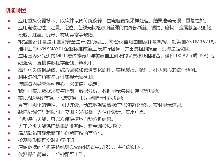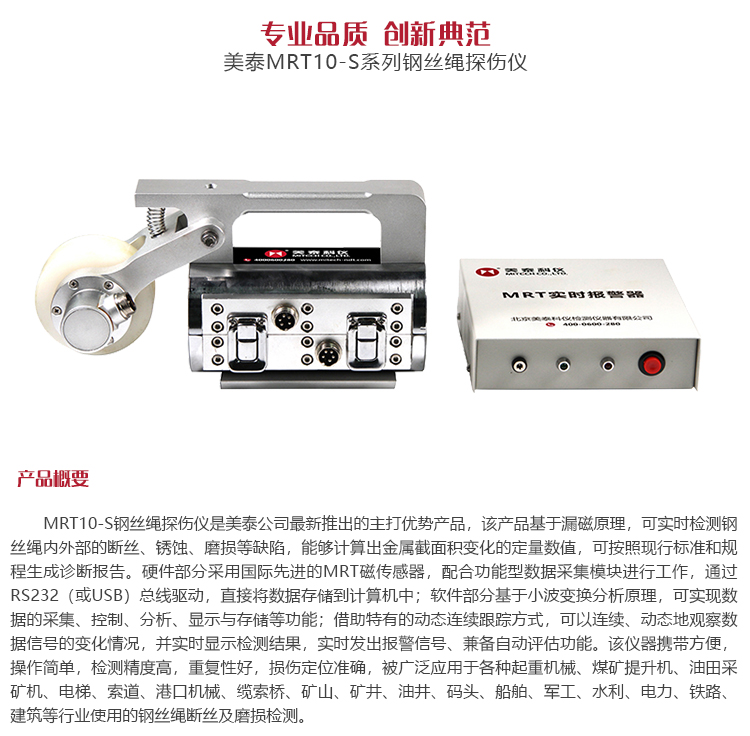 產(chǎn)品概述MRT10-S鋼絲繩探傷儀是美泰公司最新研發(fā)的無(wú)損檢測(cè)產(chǎn)品,該產(chǎn)品基于漏磁原理,可實(shí)時(shí)檢測(cè)鋼絲繩內(nèi)外部的斷絲、銹蝕、磨損等缺陷,能夠計(jì)算出金屬截面積變化的定量數(shù)值,可按照現(xiàn)行標(biāo)準(zhǔn)和規(guī)程生成診斷報(bào)告。硬件部分采用國(guó)際先進(jìn)的MRT磁傳感器,配合功能型數(shù)據(jù)采集模塊進(jìn)行工作,通過(guò)RS232(或USB)總線驅(qū)動(dòng),直接將數(shù)據(jù)存儲(chǔ)到計(jì)算機(jī)中;軟件部分基于小波變換分析原理,可實(shí)現(xiàn)數(shù)據(jù)的采集、控制、分析、顯示與存儲(chǔ)等功能;借助特有的動(dòng)態(tài)連續(xù)跟蹤方式,可以連續(xù)、動(dòng)態(tài)地觀察數(shù)據(jù)信號(hào)的變化情況,并實(shí)時(shí)顯示檢測(cè)結(jié)果,實(shí)時(shí)發(fā)出報(bào)警信號(hào);兼?zhèn)渥詣?dòng)評(píng)估功能。該儀器攜帶方便,操作簡(jiǎn)單,檢測(cè)精度高,重復(fù)性好,損傷定位準(zhǔn)確,被廣泛應(yīng)用于各種起重機(jī)械、煤礦提升機(jī)、油田采礦機(jī)、電梯、索道、港口機(jī)械、纜索橋、礦山、礦井、油井、碼頭、船舶、軍工、水利、電力、鐵路、建筑等行業(yè)使用的鋼絲繩斷絲及磨損檢測(cè)。
