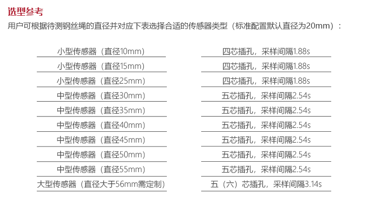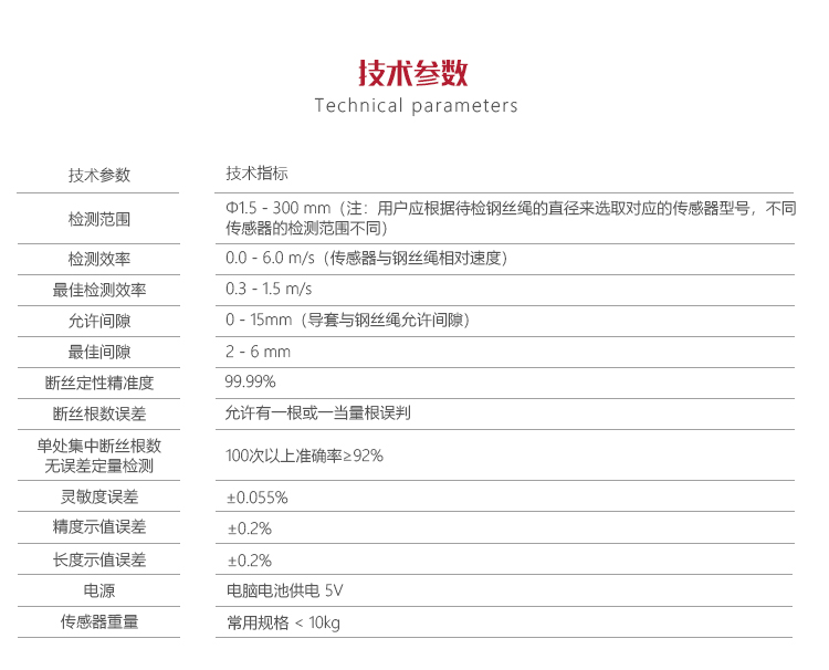 | 檢測(cè)范圍 | Φ1.5 - 36 mm(鋼絲繩直徑) |