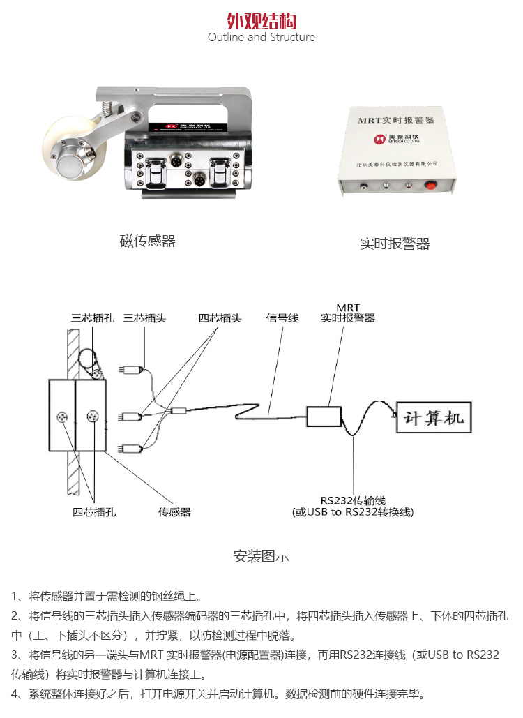 工作原理MRT10-S的工作原理是,當(dāng)鋼絲繩快速通過(guò)傳感器時(shí),傳感器中永久磁鋼軸向深度磁化鋼絲繩,并達(dá)到飽和。鋼絲繩的斷絲,磨損等缺陷同步產(chǎn)生漏磁場(chǎng)和磁通變化,向空間擴(kuò)散的磁信號(hào)經(jīng)聚磁環(huán)集聚后,由陣列廣角霍爾元件組轉(zhuǎn)換成電壓變化值,通過(guò)AD接口,進(jìn)行模數(shù)轉(zhuǎn)換,并將數(shù)字信號(hào)壓縮然后輸入PC電腦。基于三維數(shù)學(xué)模型的軟件實(shí)時(shí)解壓處理。以明確的定量數(shù)值顯示鋼絲繩內(nèi)外斷絲、銹蝕、磨損、金屬截面積變化,按現(xiàn)行標(biāo)準(zhǔn)提出鋼絲繩安全性和使用壽命的診斷評(píng)估報(bào)告。