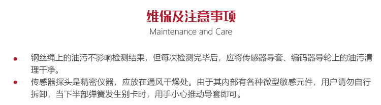 鋼絲繩上的油污不影響檢測(cè)結(jié)果,但每次檢測(cè)完畢后,應(yīng)將傳感器導(dǎo)套、編碼器導(dǎo)輪上的油污清理干凈。