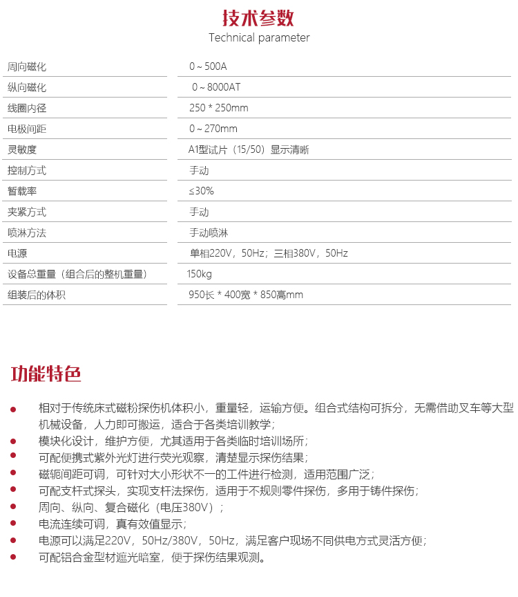 功能用途l 相對于傳統(tǒng)床式磁粉探傷機體積小,重量輕,運輸方便。組合式結(jié)構(gòu)可拆分,無需借助叉車等大型機械設(shè)備,人力即可搬運,適合于各類培訓(xùn)教學(xué)。