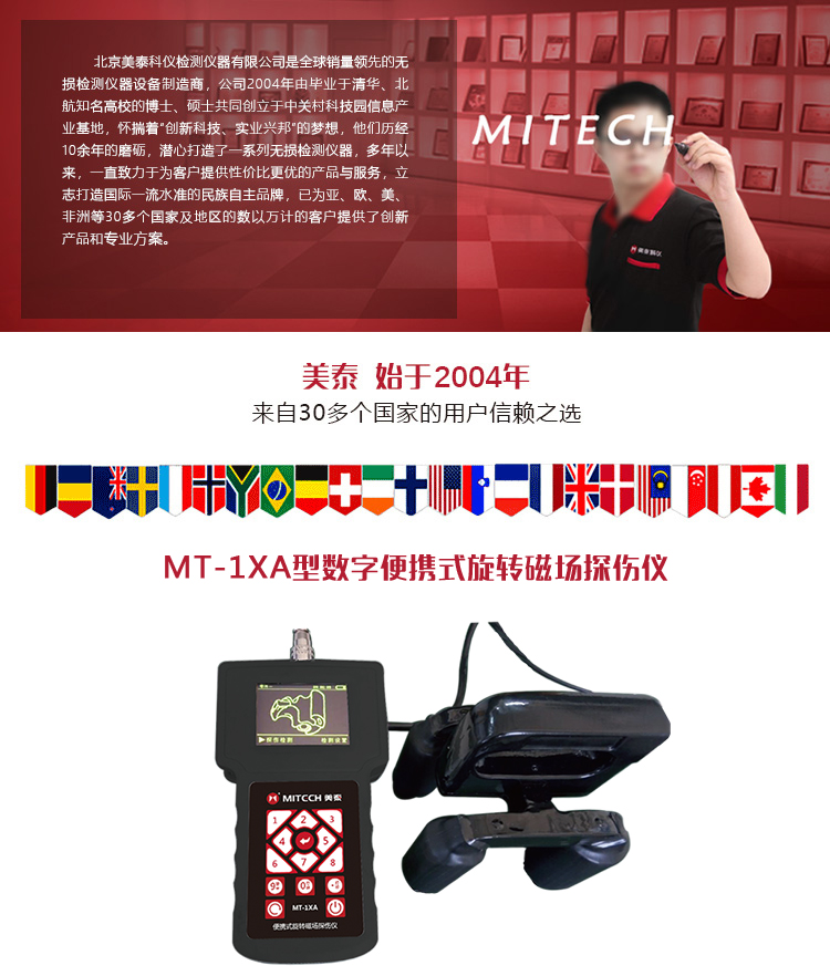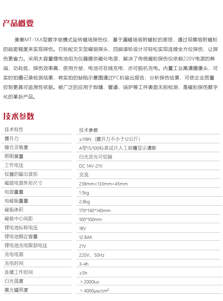 產(chǎn)品概述美泰MT-1XA型數(shù)字便攜式旋轉(zhuǎn)磁場(chǎng)探傷儀,基于漏磁場(chǎng)吸附磁粉的原理,通過觀察吸附磁粉的疏密程度來實(shí)現(xiàn)探傷。它標(biāo)配交叉型磁軛探頭,四腳滾輪設(shè)計(jì)可輕松實(shí)現(xiàn)連續(xù)全方位探傷,讓探傷更省力。采用大容量鋰電池組為儀器提供磁化電源,解決了傳統(tǒng)磁粉探傷儀依賴220V電源的弊端,功耗低,探傷效率高,使用方便,電池可在線充電,亦可脫機(jī)充電。內(nèi)置工業(yè)高清攝像頭,可實(shí)時(shí)拍攝記錄檢測(cè)結(jié)果,將實(shí)拍的缺陷示意圖通過PC機(jī)輸出報(bào)告、分析探傷結(jié)果,可使企業(yè)質(zhì)量控制更具可追溯性依據(jù)。被廣泛的應(yīng)用于焊縫、管道、鍋爐等工件表面無損檢測(cè),是磁粉探傷數(shù)字化的革新產(chǎn)品。