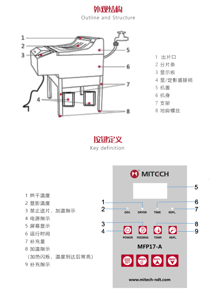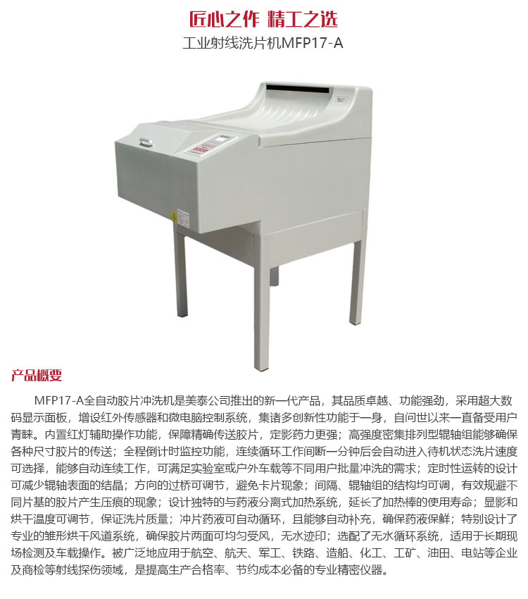 產(chǎn)品概述MFP17-A全自動(dòng)膠片沖洗機(jī)是美泰公司推出的新一代產(chǎn)品,其品質(zhì)卓越、功能強(qiáng)勁,采用超大數(shù)碼顯示面板,增設(shè)紅外傳感器和微電腦控制系統(tǒng),集諸多創(chuàng)新性功能于一身,自問世以來一直倍受用戶青睞。內(nèi)置紅燈輔助操作功能,保障精確傳送膠片,定影藥力更強(qiáng);高強(qiáng)度密集排列型輥軸組能夠確保各種尺寸膠片的傳送;全程倒計(jì)時(shí)監(jiān)控功能,使循環(huán)工作完成一分鐘自動(dòng)進(jìn)入待機(jī)狀態(tài);洗片速度可選擇,能夠自動(dòng)連續(xù)工作,滿足實(shí)驗(yàn)室或戶外車載等不同用戶批量沖洗的需求;定時(shí)性運(yùn)轉(zhuǎn)的設(shè)計(jì)可減少輥軸表面的結(jié)晶;方向的過橋可調(diào)節(jié),避免卡片現(xiàn)象;間隔、輥軸組的結(jié)構(gòu)均可調(diào),有效規(guī)避不同片基的膠片產(chǎn)生壓痕的現(xiàn)象;設(shè)計(jì)獨(dú)特的與藥液分離式的加熱系統(tǒng),延長了加熱棒的使用壽命;顯影和烘干溫度可調(diào)節(jié),保證洗片質(zhì)量;沖片藥液可自動(dòng)循環(huán),且能夠自動(dòng)補(bǔ)充,確保藥液保鮮;特別設(shè)計(jì)了專業(yè)的雛形烘干風(fēng)道系統(tǒng),確保膠片兩面可均勻受風(fēng),無水跡印;選配無水循環(huán)系統(tǒng),適用于長期現(xiàn)場(chǎng)檢測(cè)及車載操作。被廣泛地應(yīng)用于航空、航天、軍工、鐵路、造船、化工、工礦、油田、電站等企業(yè)及商檢等射線探傷領(lǐng)域,是提高生產(chǎn)合格率、節(jié)約成本必備的專業(yè)精密儀器。