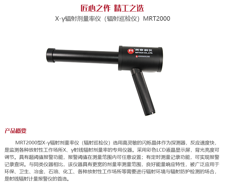 MRT2000型X-γ輻射劑量率儀(輻射巡檢儀) 選用高靈敏的閃爍晶體作為探測器,反應(yīng)速度快,是監(jiān)測各種放射性工作場所X、γ射線輻射劑量率的專用儀器。采用彩色LCD液晶顯示屏,背光亮度可調(diào)節(jié)。具有超閾值報警功能,報警閾值在測量范圍內(nèi)可任意設(shè)置;有定時測量記錄功能,可實(shí)現(xiàn)報警記錄查詢。與同類儀器相比,該儀器具有更寬的劑量率測量范圍,良好能量響應(yīng)特性,被廣泛應(yīng)用于環(huán)保、衛(wèi)生、冶金、石油、化工、各種放射性工作場所等需要進(jìn)行輻射環(huán)境與輻射防護(hù)檢測的場合,是射線輻射計(jì)量報警儀的首選。