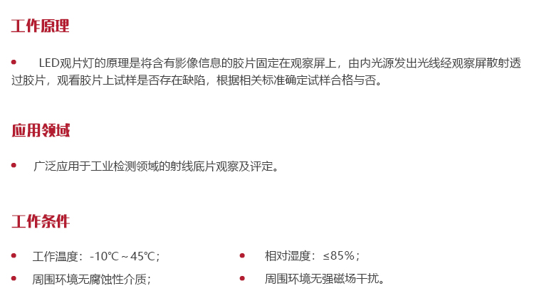 工作原理LED觀片燈的原理是將含有影像信息的膠片固定在觀察屏上,由內(nèi)光源發(fā)出光線經(jīng)觀察屏散射透過膠片,觀看膠片上試樣是否存在缺陷,根據(jù)相關標準確定試樣合格與否。