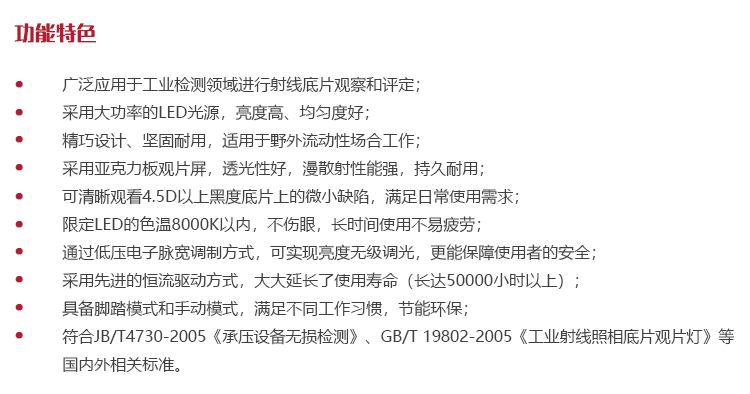 符合JB/T4730-2005《承壓設備無損檢測》、GB/T 19802-2005《工業(yè)射線照相底片觀片燈》等國內(nèi)外相關標準。