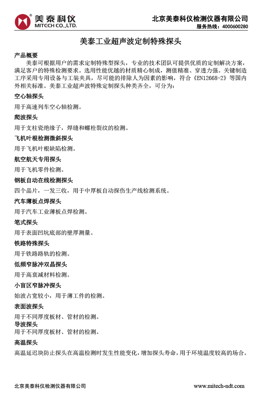 美泰可根據(jù)用戶的需求定制特殊型探頭,專業(yè)的技術(shù)團(tuán)隊(duì)可提供優(yōu)質(zhì)的定制解決方案,滿足客戶的特殊檢測(cè)要求。選用性能優(yōu)越的材質(zhì)精心制成,測(cè)值精準(zhǔn)、穿透力強(qiáng)。關(guān)鍵制造工序采用專用設(shè)備與工裝夾具,盡可能的排除人為因素的影響,符合《EN12668-2》等國(guó)內(nèi)外相關(guān)標(biāo)準(zhǔn)。
