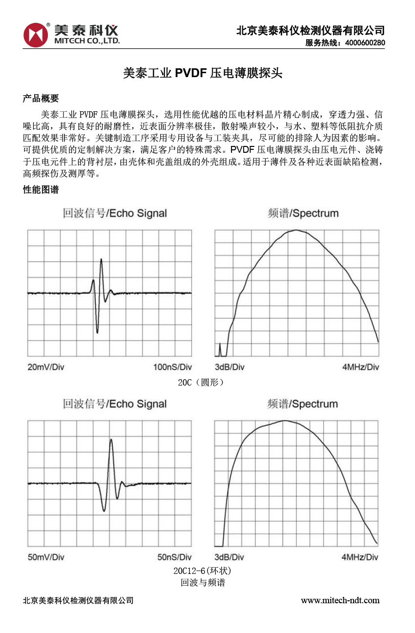 產(chǎn)品概述美泰工業(yè)PVDF壓電薄膜探頭,選用性能優(yōu)越的壓電材料晶片精心制成,穿透力強(qiáng)、信噪比高,具有良好的耐磨性,近表面分辨率極佳,散射噪聲較小,與水、塑料等低阻抗介質(zhì)匹配效果非常好。關(guān)鍵制造工序采用專用設(shè)備與工裝夾具,盡可能的排除人為因素的影響??商峁﹥?yōu)質(zhì)的定制解決方案,滿足客戶的特殊需求。PVDF壓電薄膜探頭由壓電元件、澆鑄于壓電元件上的背襯層,由殼體和殼蓋組成的外殼組成。適用于薄件及各種近表面缺陷檢測(cè),高頻探傷及測(cè)厚等。