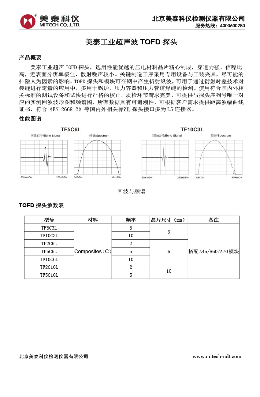 美泰工業(yè)超聲TOFD探頭,選用性能優(yōu)越的壓電材料晶片精心制成,穿透力強(qiáng)、信噪比高,近表面分辨率極佳,散射噪聲較小。關(guān)鍵制造工序采用專用設(shè)備與工裝夾具,盡可能的排除人為因素的影響。TOFD探頭和楔塊可在鋼中產(chǎn)生折射縱波,可用于通過衍射時(shí)差技術(shù)對裂縫進(jìn)行定量的應(yīng)用中,多用于鍋爐,壓力容器和壓力管道焊縫的檢測。使用符合國內(nèi)外相關(guān)標(biāo)準(zhǔn)的測試設(shè)備和試塊進(jìn)行嚴(yán)格的校正,質(zhì)檢環(huán)節(jié)苛求完美,可提供與探頭序列號(hào)唯一對應(yīng)的實(shí)測回波波形圖和頻譜圖,所有數(shù)據(jù)具有可追溯性,可根據(jù)客戶需求提供距離波幅曲線證書,符合《EN12668-2》等國內(nèi)外相關(guān)標(biāo)準(zhǔn),探頭接口多為L5連接器。