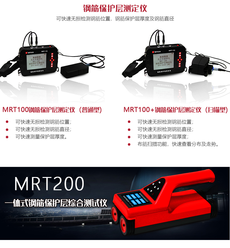 產(chǎn)品概述美泰MRT-100 / MRT-100 +鋼筋保護(hù)層測定儀,基于電磁感應(yīng)原理,可快速無損檢測鋼筋位置、鋼筋保護(hù)層厚度及鋼筋直徑。其測量速度快、測量精度高、性能穩(wěn)定可靠,具有布筋掃描功能(MRT-100 +),適用于對現(xiàn)有鋼筋混凝土工程及新建鋼筋混凝土結(jié)構(gòu)施工質(zhì)量的檢測,也可對非磁性和非導(dǎo)電介質(zhì)中的磁性體及導(dǎo)電體的位置進(jìn)行檢測,是一款專業(yè)多功能智能型精密無損檢測儀器。