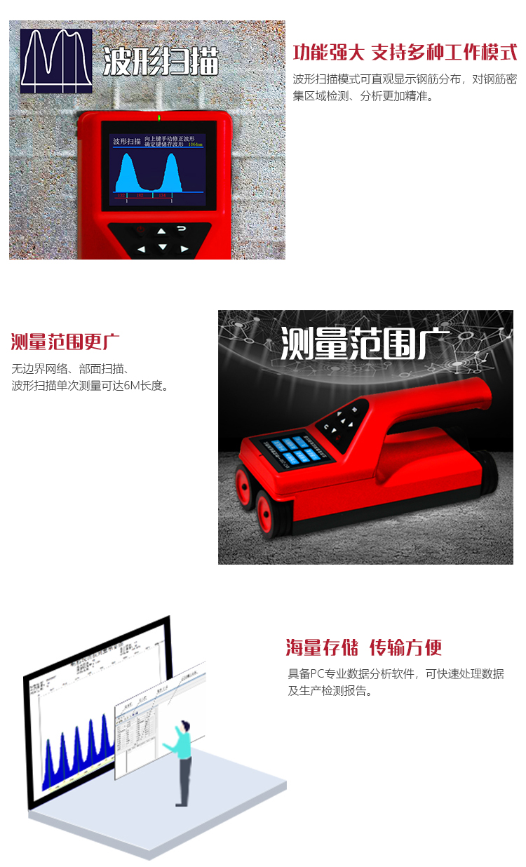 l 能夠準(zhǔn)確的進(jìn)行混凝土結(jié)構(gòu)中鋼筋的定位、查看走向,測量保護(hù)層厚度及鋼筋直徑;