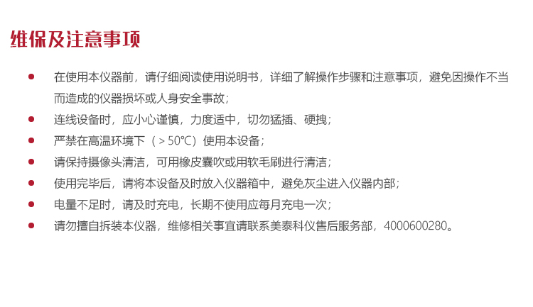 l 請(qǐng)勿擅自拆裝本儀器,維修相關(guān)事宜請(qǐng)聯(lián)系美泰科儀售后服務(wù)部,4000600280。