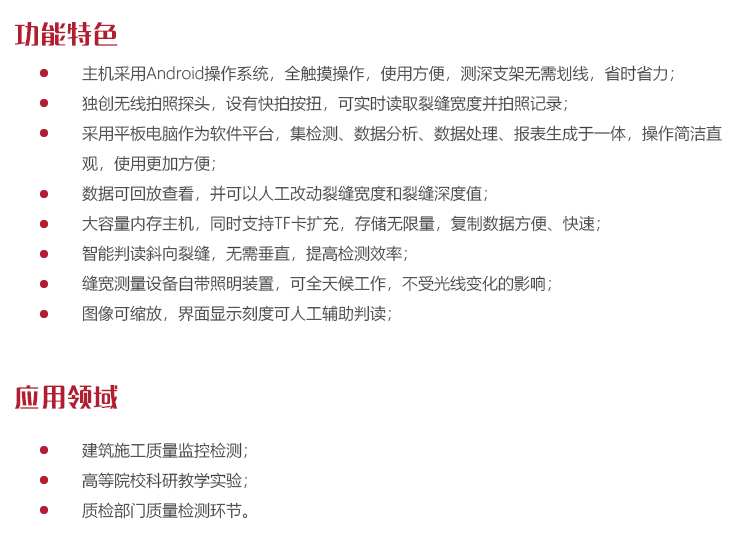 工作原理美泰MCC-800無線型裂縫綜合檢測儀,集裂縫測寬和測深的功能于一體,通過無線信號傳輸,可自動(dòng)識別多種探頭,能夠快速無損檢測構(gòu)件表面裂縫寬度及深度。其測量速度快、測量精度高、性能穩(wěn)定可靠,可實(shí)現(xiàn)自動(dòng)測量,自動(dòng)判讀及存儲(chǔ),被廣泛的應(yīng)用于橋梁、隧道、塔、建筑物、混凝土構(gòu)件、路面等領(lǐng)域的工程質(zhì)量檢測,是保障生命財(cái)產(chǎn)安全必備的專業(yè)精密檢測儀器。