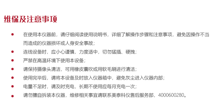 l 請(qǐng)勿擅自拆裝本儀器,維修相關(guān)事宜請(qǐng)聯(lián)系美泰科儀售后服務(wù)部,4000600280。