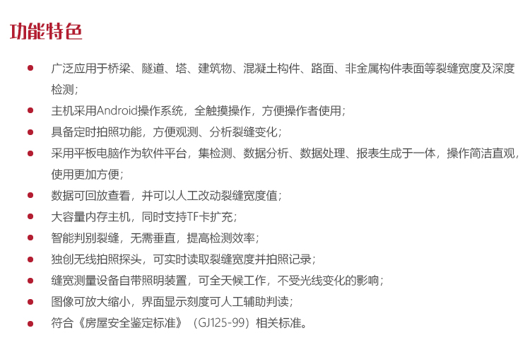 儀器特點(diǎn)l 廣泛應(yīng)用于橋梁、隧道、塔、建筑物、混凝土構(gòu)件、路面、非金屬構(gòu)件表面等裂縫寬度及深度檢測;