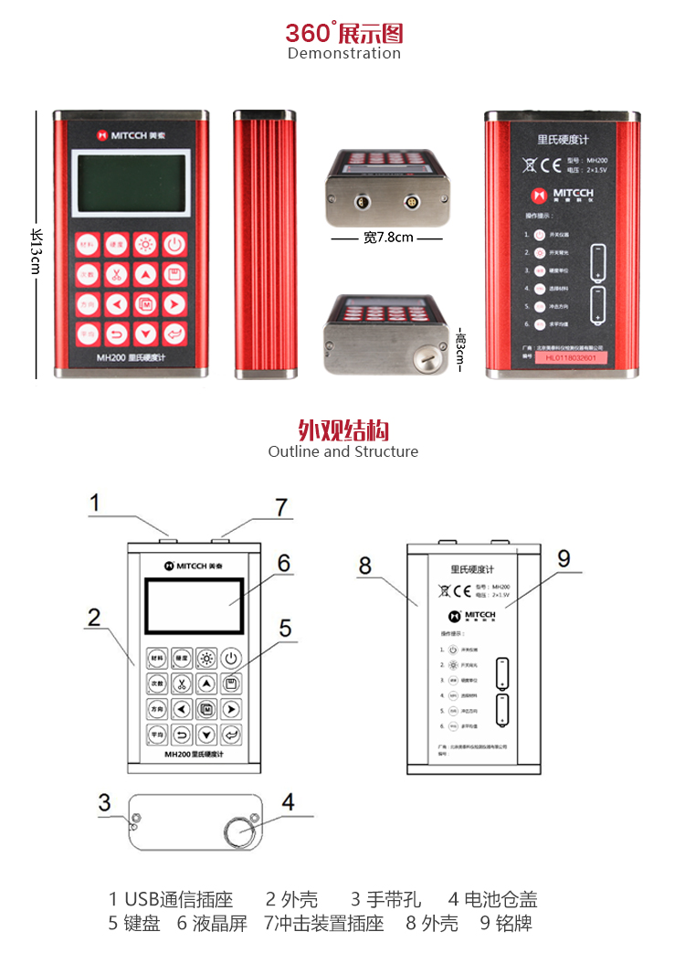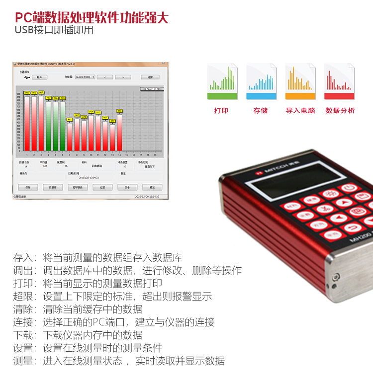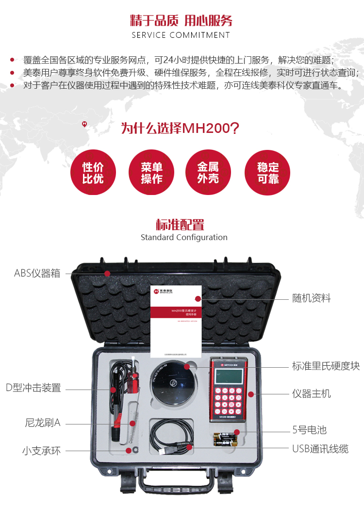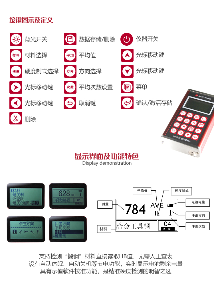 產(chǎn)品概述MH200便攜式里氏硬度計(jì),基于里氏硬度測(cè)量原理,可方便快捷地現(xiàn)場(chǎng)檢測(cè)多種金屬材料的硬度,支持里氏、布氏、洛氏等多種硬度制氏間的自由轉(zhuǎn)換。它采用國(guó)際流行的全封閉鋁美合金外殼,堅(jiān)固耐用,擁有強(qiáng)大的抗電磁、抗振動(dòng)、抗干擾能力;低功耗設(shè)計(jì)依托穩(wěn)定的IC集成電路,性能可靠;全中文點(diǎn)陣液晶顯示,菜單式操作簡(jiǎn)單快捷;支持PC機(jī)通訊及打印功能。被廣泛應(yīng)用于退火、回火、淬火熱處理工件的質(zhì)量控制;機(jī)床導(dǎo)軌、汽車底盤的硬度檢測(cè);大型不可拆卸零部件的現(xiàn)場(chǎng)在役硬度測(cè)試;五金、鍛造、機(jī)床、特種鋼材的質(zhì)量檢測(cè);批量生產(chǎn)過程中產(chǎn)品的質(zhì)量控制等,質(zhì)優(yōu)價(jià)廉,實(shí)用經(jīng)濟(jì),是硬度檢測(cè)常規(guī)需求的明智之選。