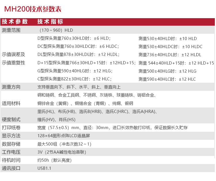 | 單位制式 | 里氏(HL)、布氏(HB)、洛氏B(HRB)、洛氏C(HRC)、洛氏A(HRA)、維氏(HV)、肖氏(HS) |